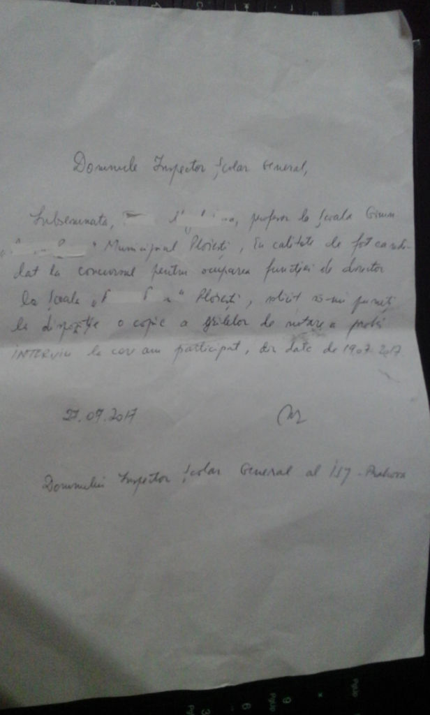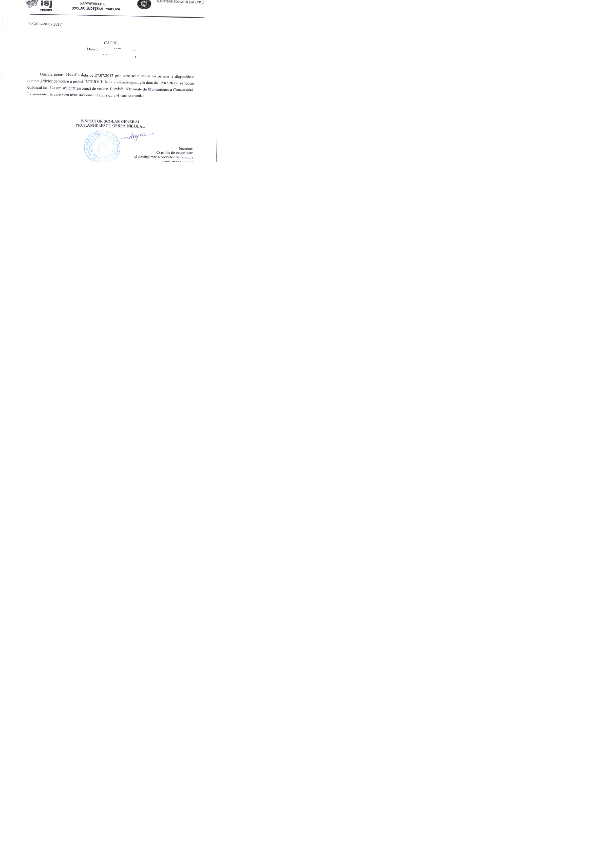 Înainte de începerea concursului, mai exact înainte de proba scrisă, în data de 14.07.2017, am solicitat ISJ-Prahova să îşi exprime punctul de vedere legat de un articol din metodologia de concurs, şi anume, legat de articolul care obliga inspectorii să depună declaraţie pe proprie răspundere dacă au relaţii conflictuale cu vreun candidat. Deoarece în momentul în care am depus la sediul inspectoratului dosarul pentru înscrierea la concurs, inspectorul care prelua dosarele s-a comportat cel putin ciudat în momentul în care am intrat în sală, dacă nu penibil (a cerut să fie sunată jurista Mănăilă Paula, care era presedinta comisiei, pentru că a sosit Toma; a refuzat să preia dosarul meu şi a solicitat unui alt membru să se uite pe actele mele; m-a atenţionat că am contracandidat(se pot vedea înregistrările), am consultat un avocat care mi-a sugerat să cer inspectoratului punctul de vedere despre art. 30, pentru a vedea dacă responsabilii cu organizarea concursului se consideră sau nu în conflict cu mine, în calitatea mea de candidat.