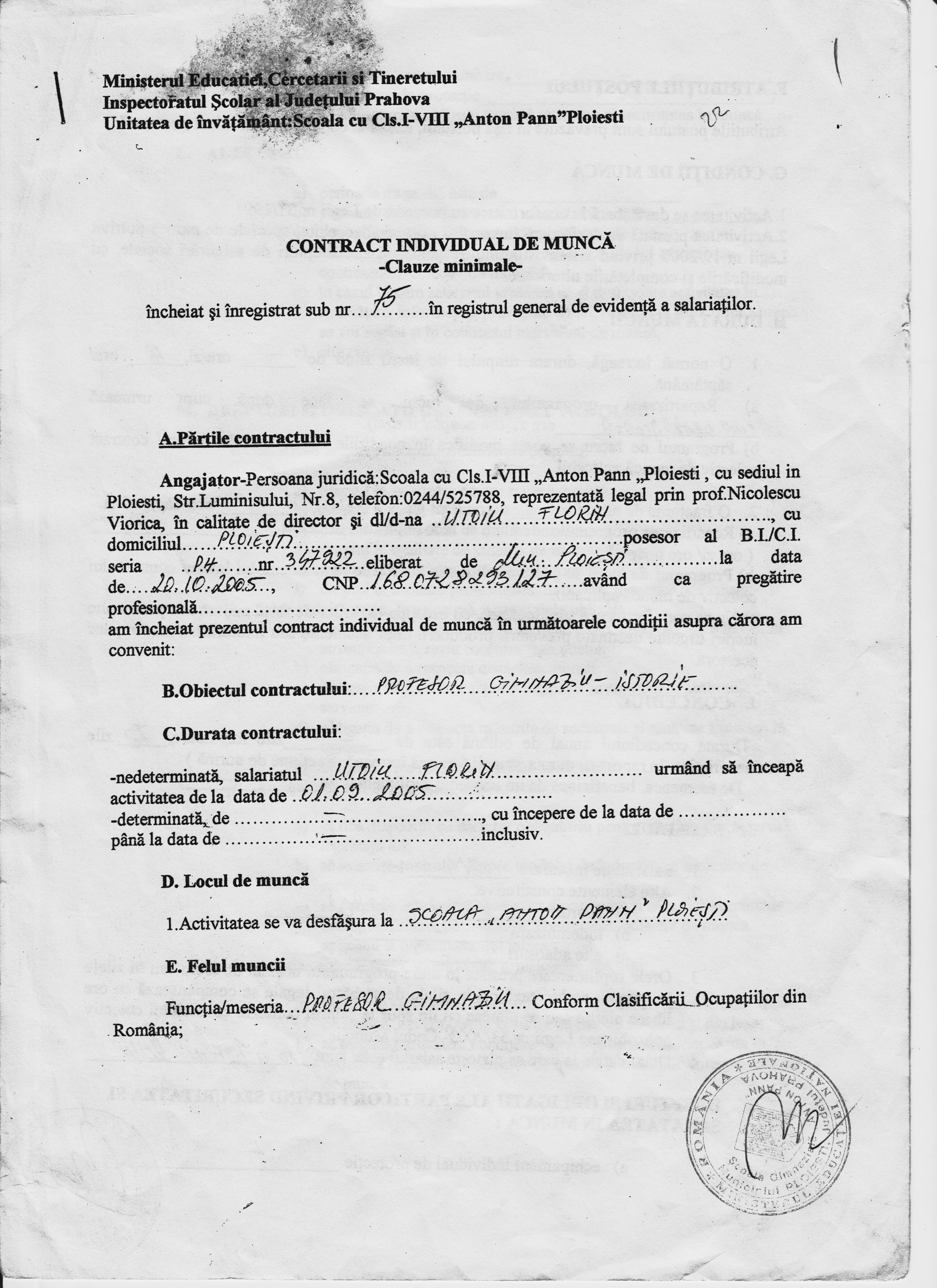 El nu mai exista la angajator, PENTRU CA DIRECTOR SANDU LAURA L-A FALSIFICAT si A FACUT STRUTO- CAMILA de CONTRACT HIBRID NEDETERMINATO- DETERMINATA PE CARE TREBUIA SA IL ANULATI CONFORM CAPATULUI DE CERERE al prof. Utoiu Florin , nu sa incepeti sa decripati Codul Muncii de care HABAR NU AVETI!