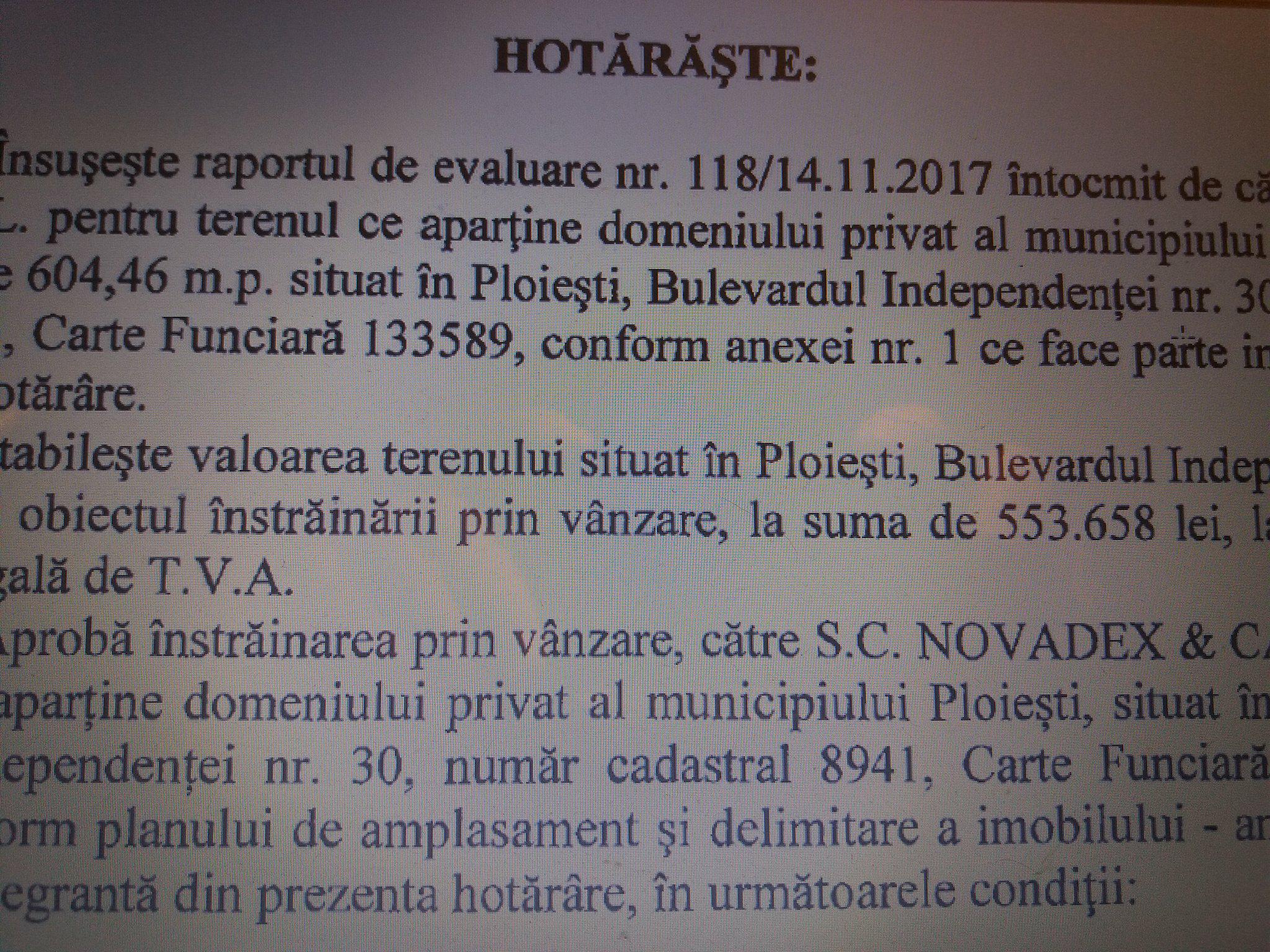 O Hotarare a Consiliului Local Ploiesti ne-a pus pe ganduri. Cu un evaluator de prin Craiova, Consiliul Local Ploiesti va vinde, la un prêt derizoriu (197 Euro/m.p), 604,46 m.p situat in Ploiesti, Bulevardul Independentei nr 39, firmei NOVADEX&CA SRL, conform Hotararii nr 89 din 29.03.2018. Ce interese se ascund in spatele acestei societati si cine este personajul din administratia locala aflat in spatele acestei actiuni va lasam pe dumneavoastra sa ghiciti pana la viitorul numar in care vom reveni si cu niscai’ aspecte penale privind si un off-shore ce apare in aceasta “increngatura” pe care poate o va sesiza si cei de la D.N.A –ST Ploiesti daca nu sunt prea “ocupati”.