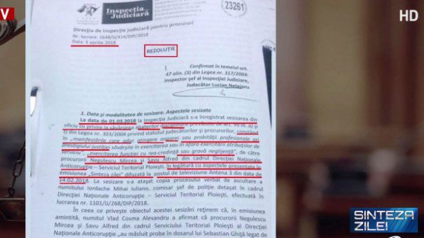 Conform EVZ, documentul a fost prezentat, joi seară, la Antena 3 și este confirmat în temeiul articolului 47, aliniatul 3 din Legea 317/2004, de inspector șef al Inspecției Judiciare, judecător Lucian Netejoru.