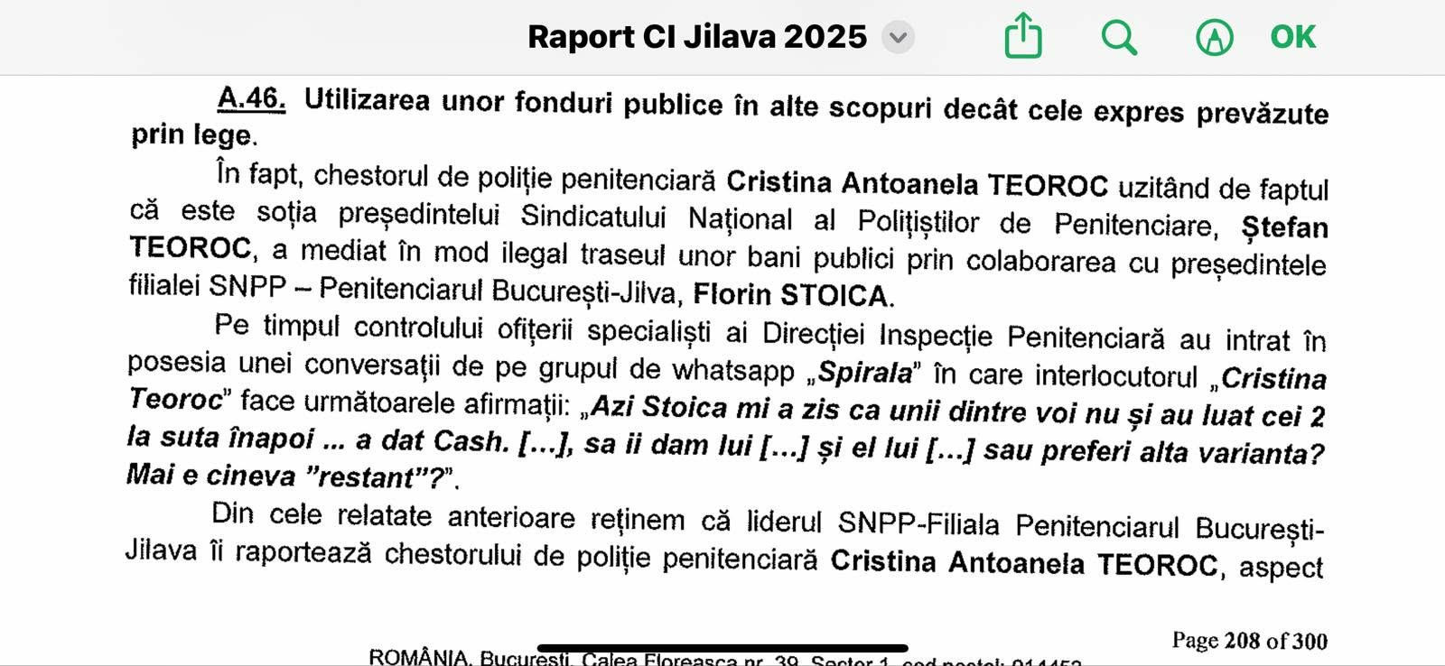 În centrul rețelei, potrivit notelor de relații și rapoartelor de control nr. 46758, 46788 și 47037 din noiembrie 2025, se află Antoanela Cristina Teoroc, fost director al Penitenciarului București-Jilava, soția liderului SNPP, Ștefan Teoroc. Ea este acuzată de un comportament abuziv, limbaj suburban și utilizare discreționară a funcției publice.