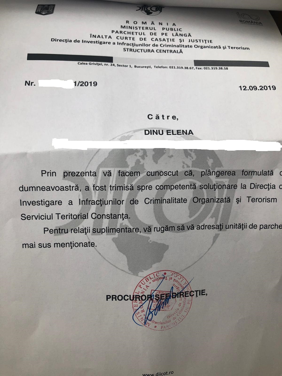Precizam ca sunt îndeplinite toate condițiile începerii urmăririi penale, fapt pentru care persoana vătămată Dinu Elena a sesizat DNA STRUCTURA CENTRALA, DIICOT si SRI impotriva făptuitorilor, persoane fizice si juridice, constituite într-un grup infracțional organizat care acționează pe raza UAT oraș Năvodari, jud. Constanța.