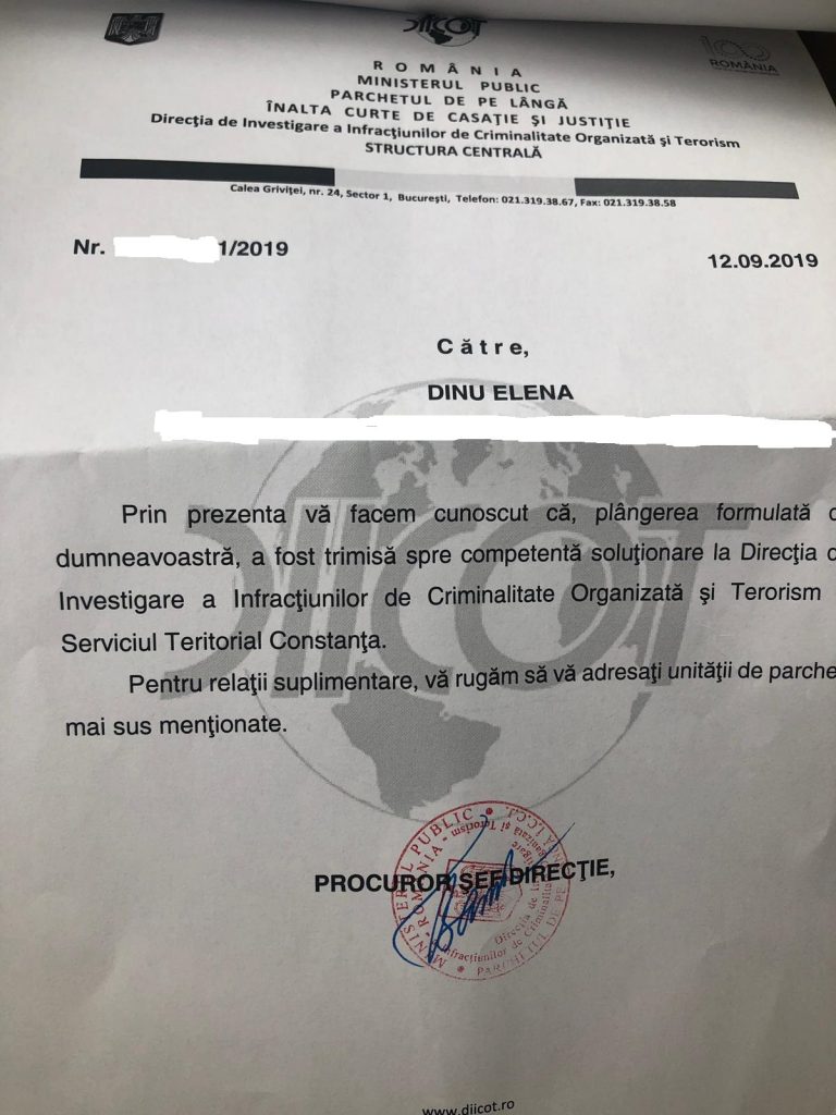 Precizam ca sunt îndeplinite toate condițiile începerii urmăririi penale, fapt pentru care persoana vătămată Dinu Elena a sesizat DNA STRUCTURA CENTRALA, DIICOT si SRI impotriva făptuitorilor, persoane fizice si juridice, constituite într-un grup infracțional organizat care acționează pe raza UAT oraș Năvodari, jud. Constanța.