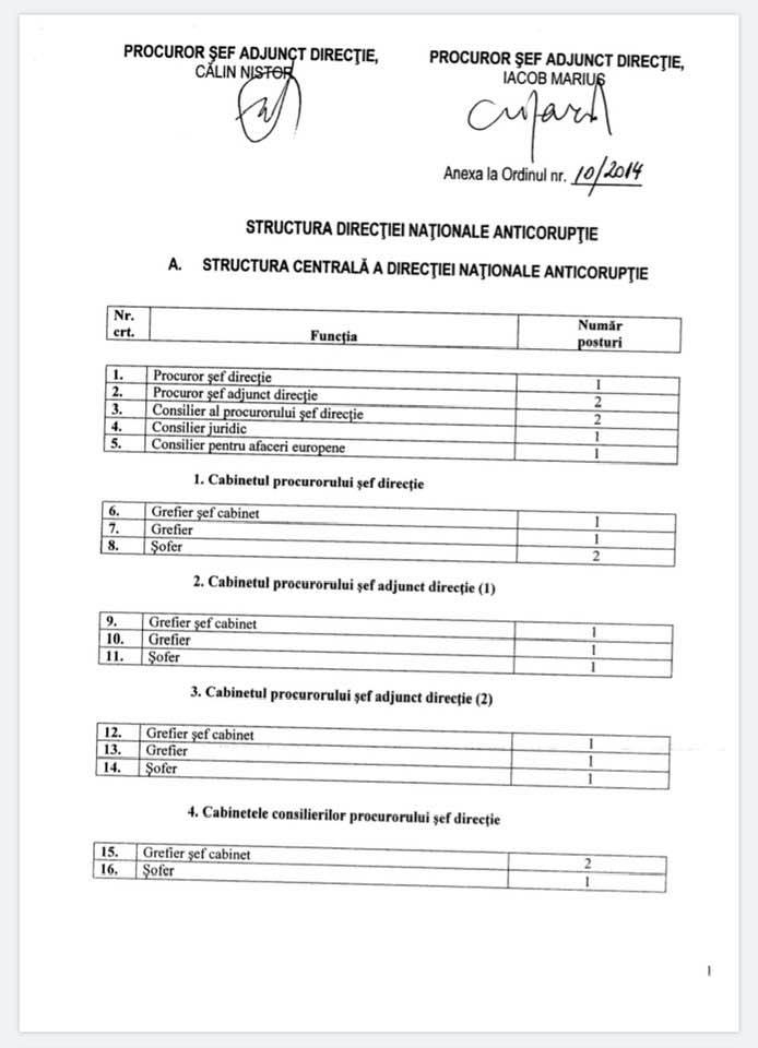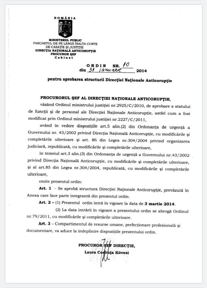 Ordinul numărul 10 din 31 Ianuarie 2014 prin care Laura Codruta Kovesi a înființat prin reorganizarea DNA, după ce a fost numită în 2013 în fruntea DNA printr-un troc politic, SERVICIUL DE COMBATERE A CORUPȚIEI DIN JUSTIȚIE ca să controleze, monitorizeze, supravegheze și să pună presiune pe magistratura României.