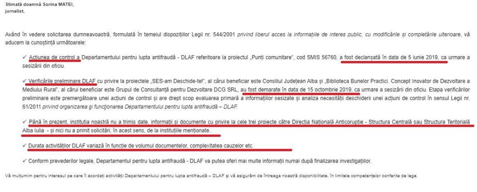 Până în prezent, 29 octombrie 2019, deşi ancheta e publică de 2 săptămâni deja, DLAF „NU A TRIMIS date, informații și documente cu privire la cele trei proiecte către Direcția Națională Anticorupție – Structura Centrală sau Structura Teritorială Alba Iulia – ŞI NICI NU A PRIMIT SOLICITĂRI, în acest sens, de la instituțiile menționate”. Practic, DNA nu a fost interesată.