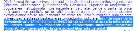 „Informațiile care privesc statutul judecătorilor și procurorilor, organizarea judiciară, organizarea și funcționarea Consiliului Superior al Magistraturii, cooperarea instituțională între instanțe și parchete, pe de o parte, și ORICE ALTĂ autoritate publică, pe de altă parte, precum și ACTELE ADMINISTRATIVE extrajudiciare emise sau încheiate de către sau între autoritățile publice CARE PRIVESC SAU AFECTEAZĂ desfășurarea procedurilor judiciare, PRIN DEROGARE de la prevederile art. 12 din Legea nr. 544/2001 privind liberul acces la informațiile de interes public, cu modificările și completările ulterioare, CONSTITUIE INFORMAŢII DE INTERES PUBLIC, LA CARE ACCESUL LIBER ESTE GARANTAT, precizeaza Sorina Ruxandra Matei.