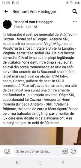 „In fotografie îl aveți pe generalul de Br.(r) Sorin Cozma – fostul șef al Brigăzii Antitero SRI, casatarorit cu nepoata lui Virgil Măgureanu! Prostu’ asta a fost in Statele Unite, la Langley – Virginia, sa viziteze sediul CIA! De aici începe comedia: CIA-ul le-au pus in piept legitimație de vizitatori “one day”, între timp si-au sunat sclavii din presa românească sa urle ca șefii serviciilor secrete de la București s-au întâlnit la cel mai înalt nivel cu oficialii CIA! Intr-o seara, Cozma, pulbere de beat, in SRI il porecliseră “F…e tot”, avea trei amante, era atât de beat încât și-a sunat una dintre amante confundand-o…cu propria nevasta! Ofițer SRI, subordonatul lui Cozma – Aeroportul Henri Coandă (Brigada Antitero – SRI): “Cătăline, frățioare, milioane de euro a făcut tiganu’ ăla de pe urma traficului de țigări și parfumurilor de lux care erau dosite in cala avioanelor” dezvaluie Reinhard Von Heidegger pe reteaua de socializare. (Cerasela N.).