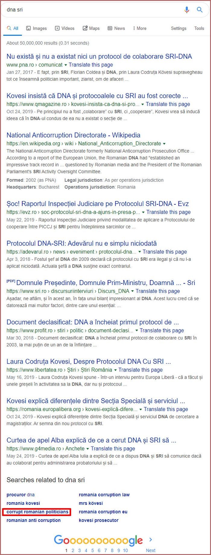 Cand scrii in motorul de cautare „dna sri” sau „sri dna” (fara ghilimele), prima pagina de rezultate se refera doar la minciunile inculpatei Laura Kovesi, care in 2017 isi dadea ochii peste cap cum ca nu ar fi existat niciun protocol intre Directia Nationala Anticoruptie si Serviciul Roman de Informatii (vezi facsimile), iar colaborarea dintre cele doua institutii de forta ar fi fost cat se poate de corecta, dezvaluie Lumea Justitiei. Intre timp, am vazut cu totii care a fost realitatea. Ca si cum nu ar fi fost de ajuns, la cautarea „dna sri” Google insusi recomanda cautarea dupa cuvintele „corrupt romanian politicians”. Cu alte cuvinte, motorul de cautare deturneaza atentia utilizatorului, dand de inteles ca marea problema este la politicienii corupti, iar nu la procurorii si la securistii care au nenorocit oameni nevinovati.