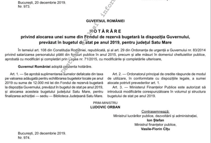 Proiectul de Hotărâre a trecut de Guvern și a fost publicat în monitorul Oficial. Hotărârea 973/20 decembrie 2019 arată însă că nu este vorba despre nicio investiție în ,,spital” ci despre ,,finalizarea achiziției” de pe piața privată a unui sediu pentru Biblioteca Județeană Satu Mare.