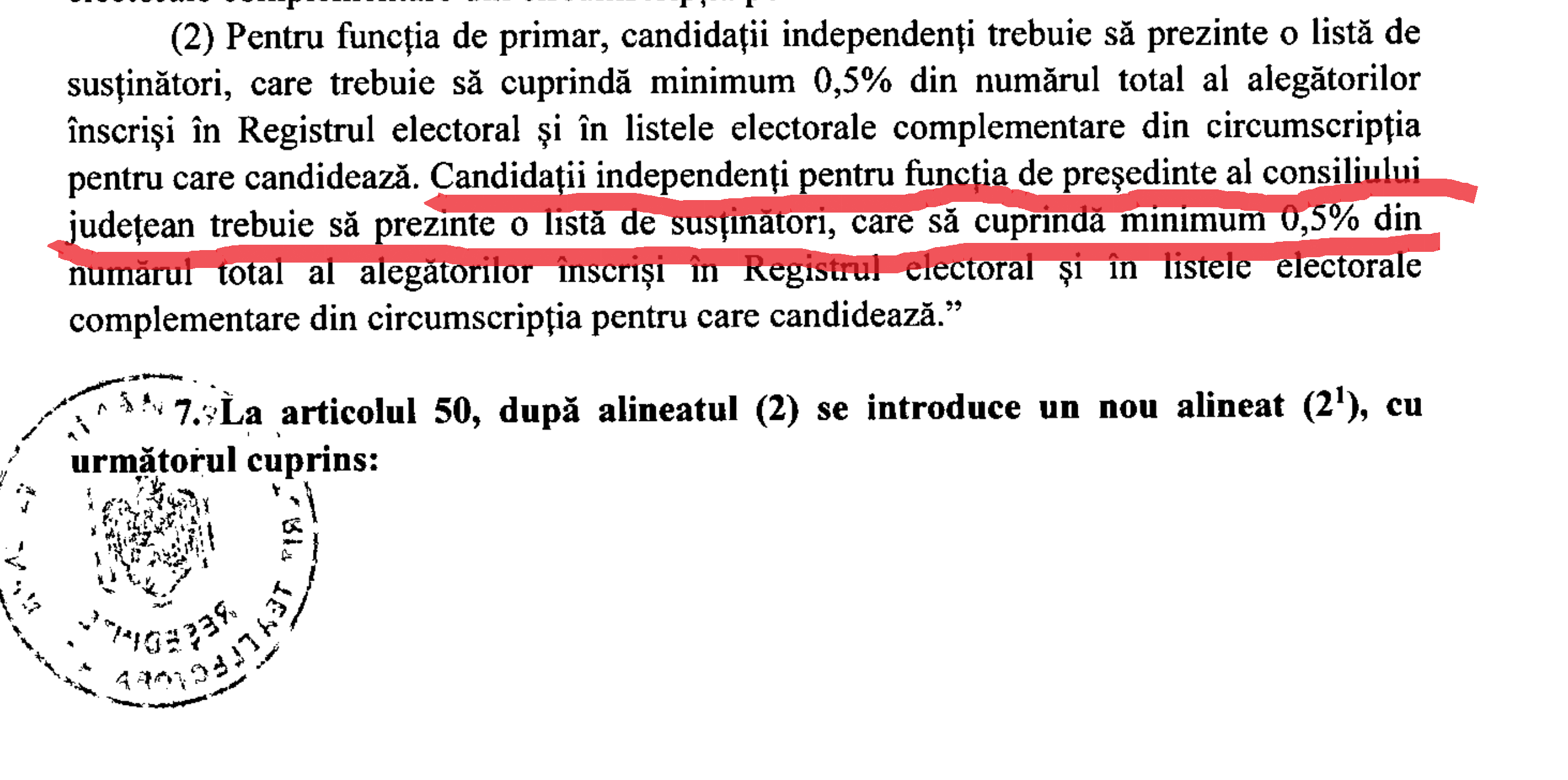 ”Candidatii independenti pentru functia de președinte al consiliului judetean trebuie să prezinte o listă de sustinători, care să cuprindă minimum 0,5% din numărul total al alegătorilor inscriși in Registrul electoral și in listele electorale complementare din circumscriptia pentru care candidează”.