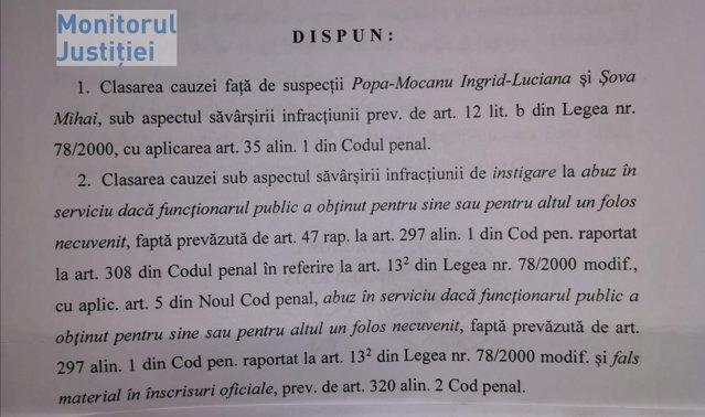 Monitorul Justitiei a aflat această soluţie, chiar dacă dosarul respectiv a fost ţinut la secret atât faţă de opinia publică, cât şi -culmea – faţă de cei doi „suspecţi” . Astfel , procurorul a dispus, negru pe alb, în ordonanţa din data de 04.09.2019, „CLASAREA cauzei faţă de suspecţii Popa-Mocanu Ingrid Luciana şi Şova Mihai, sub aspectul săvârşirii infracţiunii prev. de art.12 lit.b din Legea 78/2000, cu aplicarea art.35 alin1 din Codul penal şi CLASAREA cauzei sub aspectul săvârşirii infracţiunii de instigare la abuz în serviciu dacă funcţionarul public a obţinut pentru sine sau pentru altul un folos necuveni, faptă prevăzută de art.47 rap.la art.297 alin.1 din Cod pen. raportat la art.308 din Codul penal în referire la art.13 indice 2 din Legea 78/2000 modif, cu aplic.art. 5 din Noul Cod penal, abuz în serviciu dacă funcţionarul public a obţinut pentru sine sau pentru altul un folos necuvenit, faptă prevăzută de art.297 alin.1 din Cod penal raportat la art.13 indice 2 din Legea 78/2000 modif. şi fals material în înscrisuri oficiale”.