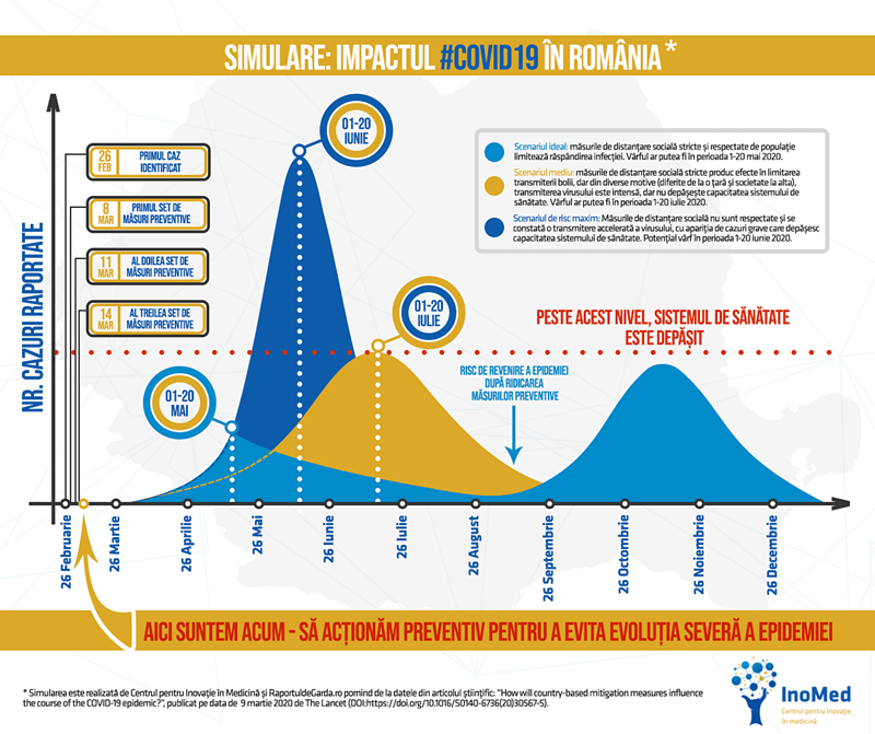 Centrul pentru Inovație în Medicină și RaportuldeGarda.ro au realizat o simulare despre posibila evoluție a epidemiei COVID-19 în România, despre momentul în care am putea avea impactul maxim și despre ce putem face încă de acum pentru a influența evoluția epidemiei și pentru a ne încadra în scenariul cel mai favorabil.