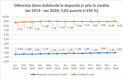 În ianuarie 2020, băncile plăteau în medie la depozitele populației 2,01% pe an, și percepeau la creditele pentru populație, în medie, 7,03% pe an. Asta înseamnă o marjă de profit de 5,02% pe an pe care BNR o conservă și o încurajează prin neluarea vreunei măsuri care să reducă povara bancară pentru populație ci din contră, să o majoreze. Graficul dobânzilor la depozite și credite în ultimul an este mai mult decât elocvent: