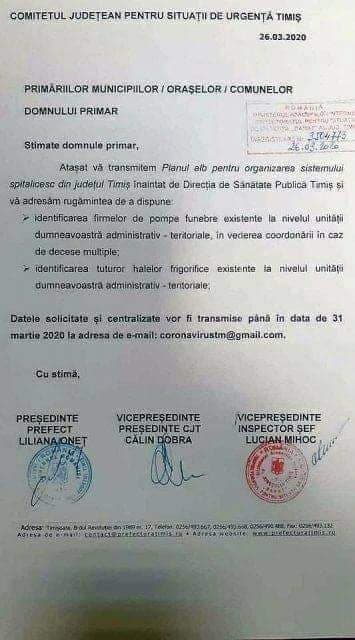 Mai nou, prefecturile și consiliile județene sunt preocupate de firmele de pompe funebre și de hale frigorifice pentru morți. Le este teama de valul imens de decese care va urma și nor sa le pută morții și nici sa rămână cadavrele neînmormântate. În loc sa se ocupe de cei vii ca sa nu moară, investind în rețeaua sanitara cu paturi (inclusiv de reactivarea spitalelor desființate de regimul sinistru Basescu- Boc), funcționarii contopit caută ciocni și groparii. Mare mirare dacă mâine nu vor solita și o situație centralizata a numărului de locuri în cimitire!!
