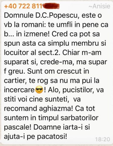 Cam acestea sunt ultimele ”coordonate-etichete” ale familiei Anisie. Cel puțin după ce soțul comisar șef Adrian Anisie s-a dat ”crescut în cartier” și a amenințat fățiș cu bătaia printr-un mesaj pe telefon pe viceprimarul Sectorului 2, Dan Cristian Popescu… Coleg în Partidul Național Liberal cu ministrul Educației, Monica Anisie. Cea care, în timp ce soțul amenință că-i altoiește pe ceilalți lideri liberali care îi deranjează consoarta ministerială, zăngăne cătușele în fața jurnaliștilor de la ”Național”! ”Vinovați” că au publicat mesajul de solidaritate de pe rețelele de socializare ale ministrului liberal față de ”uneperistul” Adrian Costache, veșnicul om al lui Onțanu din Sectorul 2. Dându-i ”like” la o postare prin care acesta atacă vehement poziția… Guvernului PNL!