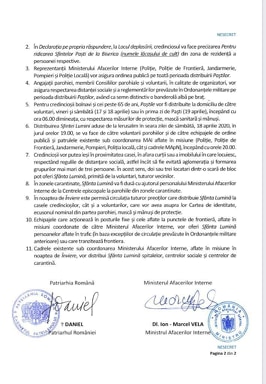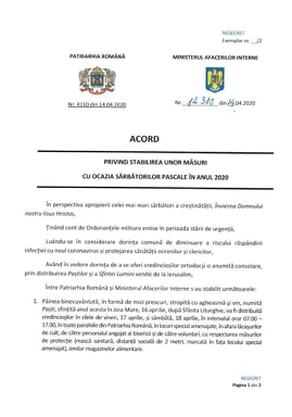 Ținând cont de decretele prezidențiale numărul 195 din 16 martie și 240 din 14 aprilie 2020, cât și de prevederile Ordonanțelor Militare emise până în prezent, astăzi am semnat împreună cu Preafericitul Daniel, Patriarhul Bisericii Ortodoxe Române, un acord de susținere și sprijin din partea tuturor forțelor coordonate în starea d eurgență de către Ministerul Afacerilor Interne, pentru stabilirea unor acțiuni comune cu ocazia sărbătorilor pascale din acest an.