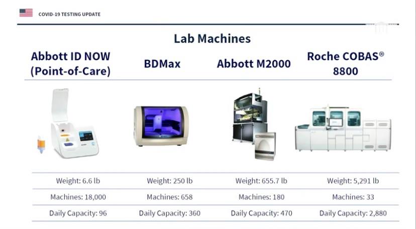 Tocmai şi-au prezentat americanii maşinile de testare. Despre prima Guvernul României spune că pur şi simplu nu există iar a 4-a face o dată mai mult decât a făcut toată România în ziua de sâmbătă, 18.04.2020. 1 (una) maşină Roche face 2880 de teste pe zi, toată România a făcut sâmbătă, înainte de Paşti, 2620 de teste. Nici cât 1 singură maşină Roche. Comunicările Guvernului României sunt făcute de proşti pentru şi mai proşti decât ei. Mai jos, document Casa Albă/POTUS. Cum v-am mai zis de zeci de ori aici, USA se bazează pe Roche. Roche nu este pe Lună, este Elveţia, Europa. Mafia Microsoft sau oricare mafie din Românica cu offshoreuri etc în Elveţia să aducă Roche. Puneţi mafia la muncă, precizeaza Sorina Ruxandra Matei. (Cerasela N.).