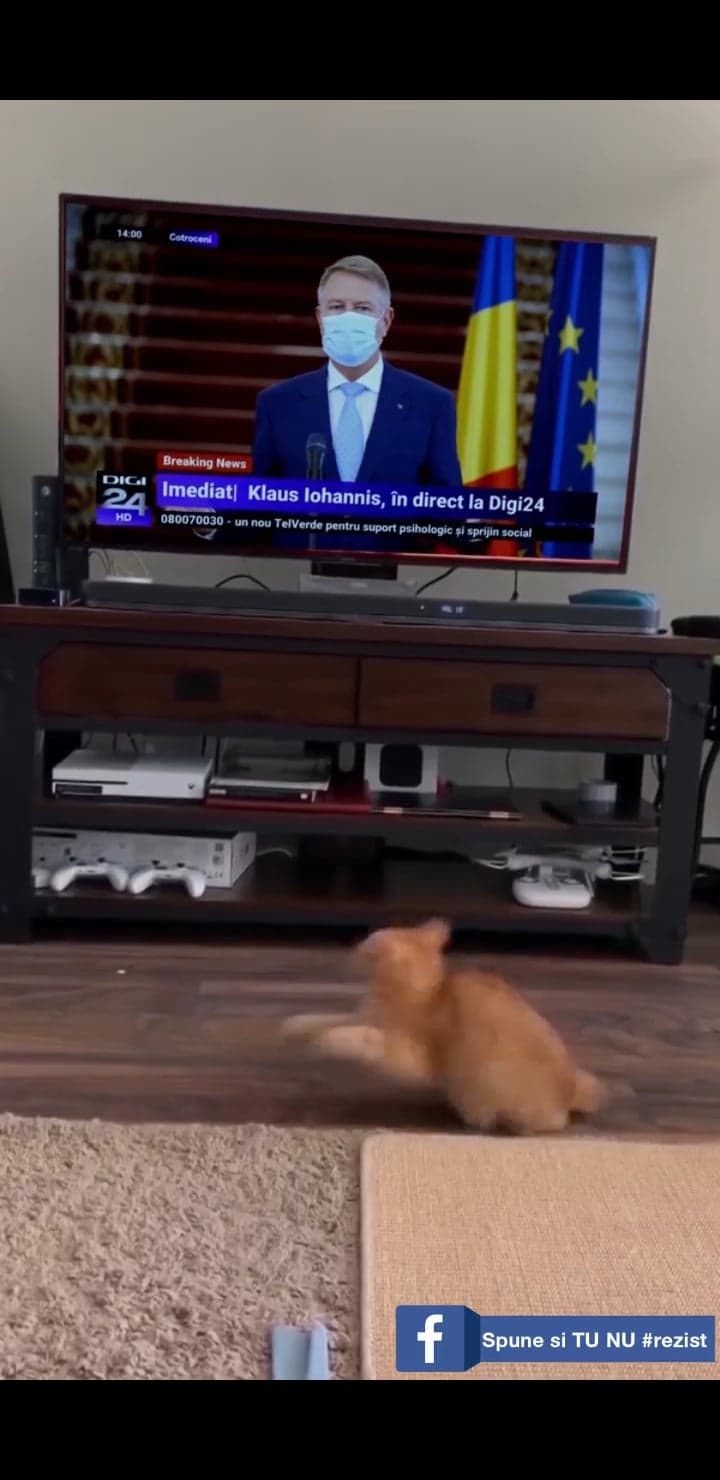 Cum se sperie o pisica atunci cand se pomeneste cu presedintele Klaus Iohannis pe un coscogeamite ecran de televizor
