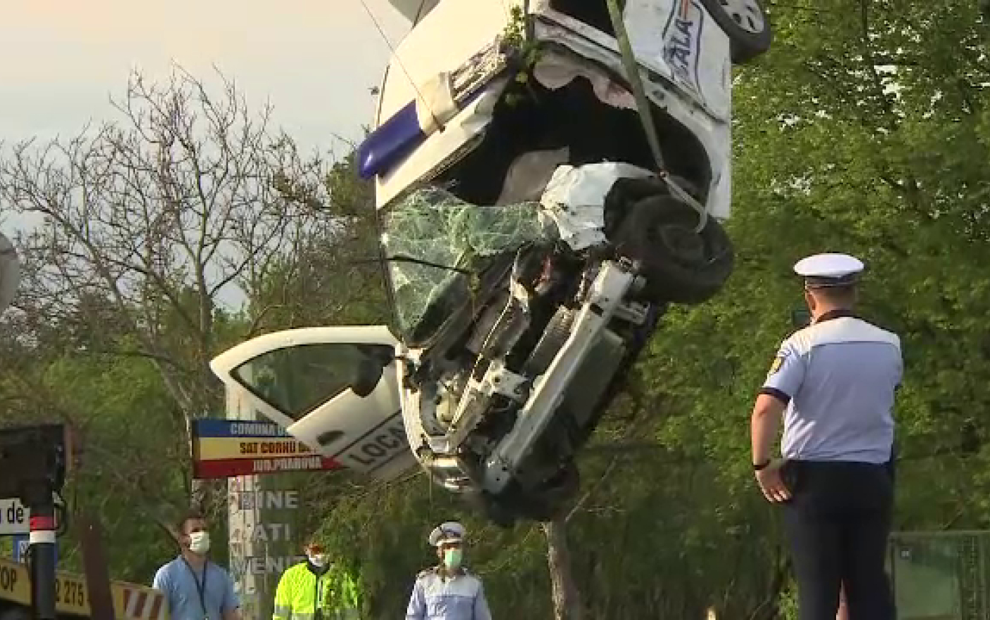 O mașină cu polițiști și jandarmi în plină misiune a fost spulberată de tren, într-o comună din Prahova.