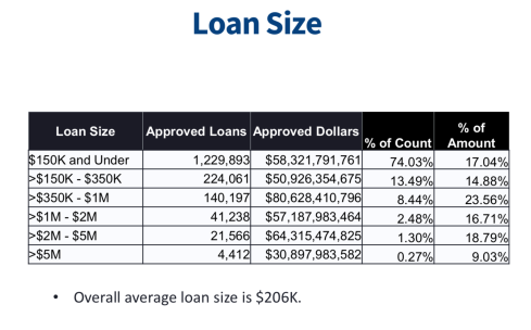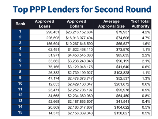 Runda 1 (până la 16 aprilie 2020). Administrația americană a garantat 1.661.367 de împrumuturi în valoare de 342,27 miliarde dolari. Valoarea medie a unui împrumut în Runda 1: 206.000 dolari. Peste 1,2 milioane de împrumuturi au fost pentru sume mai mici de 150.000 de dolari).