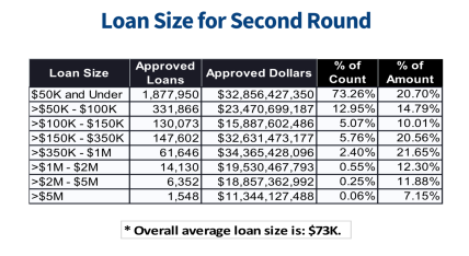 Runda 2 (27 aprilie – 8 mai). Administratia americana a garantat 2.571.167 de împrumuturi în valoare de 189 de miliarde de dolari. Valoarea medie a împrumutului garantat a fost de 73.000 de dolari;