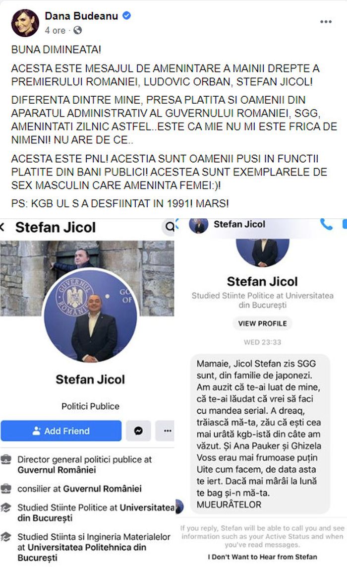 Sunt tot mai dese accesele si actiunile dictatoriale ale regimului Iohannis. Dupa ce au eliminat articolele de presa care nu le conveneau si chiar au inchis site-uri, oamenii Guvernului Orban trec mai nou la amenintari. Creatoarea de moda Dana Budeanu, incomoda pentru comentariile si criticile la adresa clasei politice si autoritatilor, a facut public un mesaj primit de la unul dintre colaboratorii premierului Ludovic Orban, zis Sica. Este vorba despre Stefan Jicol, consilier la Guvernul Romaniei, care i-a transmis ca deocamdata o iarta, dar ca ”daca mai marai la luna te bag si-n ma-ta”. Liberal adevarat. Suntem curiosi daca premierul Orban va avea vreo reactie. Daca il va mai tine pe functie pe acest personaj…(Irinel I.).