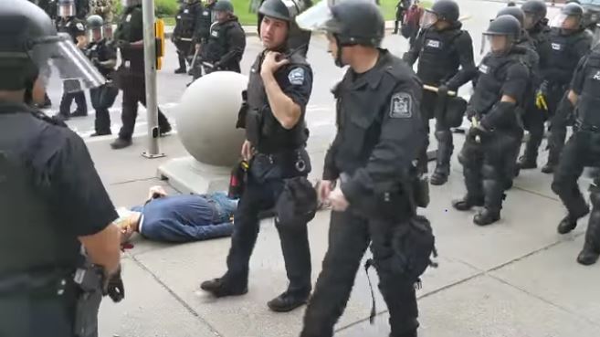 În filmare se observă cum majoritatea polițiștilor care au fost martori la incident pleacă de lângă bărbatul aflat la pământ. Cu toate că agentul care l-a împins cu bastonul pe bărbat se apleacă pentru a vedea în ce stare se află acesta, un alt polițist îl convinge să plece.