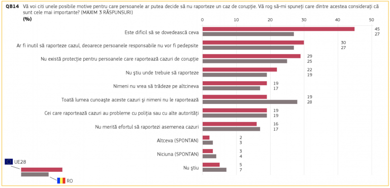 În ceea ce privește raportarea corupției către autoritățile abilitate, peste 28% dintre respondenții români sunt de părere că acest lucru ar fi inutil deoarece fie este dificil să dovedească ceva, fie persoanele vinovate nu vor fi pedepsite sau cazurile de corupție sunt cunoscute, dar ignorate. De asemenea, 25% din români nu ar raporta un caz de corupție deoarece nu există protecție pentru denunțător.
