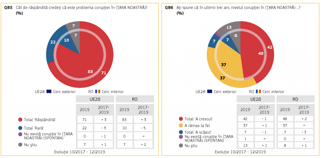 Referitor la percepția privind răspândirea și evoluția corupției în ultimii trei ani în România, 83% dintre români sunt convinși că există probleme de corupție în țară, iar 48% dintre aceștia consideră că fenomenul s-a amplificat între 2017-2019. Această percepție este mai accentuată în România, față de UE, unde doar 71% dintre europeni au identificat existența fenomenului, în timp ce doar 42% au declarat că acesta s-a exacerbat.