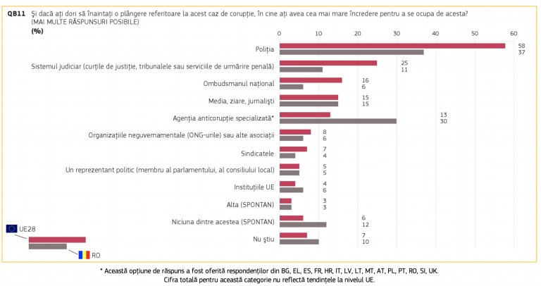 Dacă ar trebui să înainteze o plângere referitoare la acest caz de corupție, 37% dintre români ar avea cea mai mare încredere privind rezolvarea acestuia în Poliție, iar 30% în agenția anticorupție specializată. Cea mai puțină încredere privind rezolvarea cazului de corupție românii o au în sistemul național de justiție (11%), ombudsmanul național sau instituțiile UE (ambele 6%).