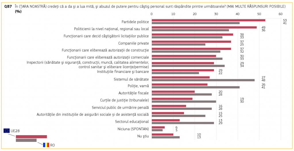 Aproximativ jumătate dintre români (48%) consideră că mita și abuzul de putere pentru câștig personal sunt cele mai răspândite în sănătate, poliție și în rândul partidelor politice (ambele 41%), precum și printre politicienii de la toate nivelurile administrative (36) și în educație (29%). Instituțiile financiare/bancare și mediul privat ar fi printre sectoarele cel mai puțin afectate de luarea de mită și abuzul de putere dintre domeniile de activitate ale Eurobarometrului. De cealaltă parte, 53% dintre europeni identifică problema cea mai gravă cu mita și abuzul de putere în rândul partidelor politice și al politicienilor de la nivel național, regional sau local (49%), în timp ce domeniile cel mai puțin afectate de aceste practici sunt educația (13%), instituțiile de asigurări sociale și de asistență socială (15%) sau procuratura (16%) și tribunalele (19%).