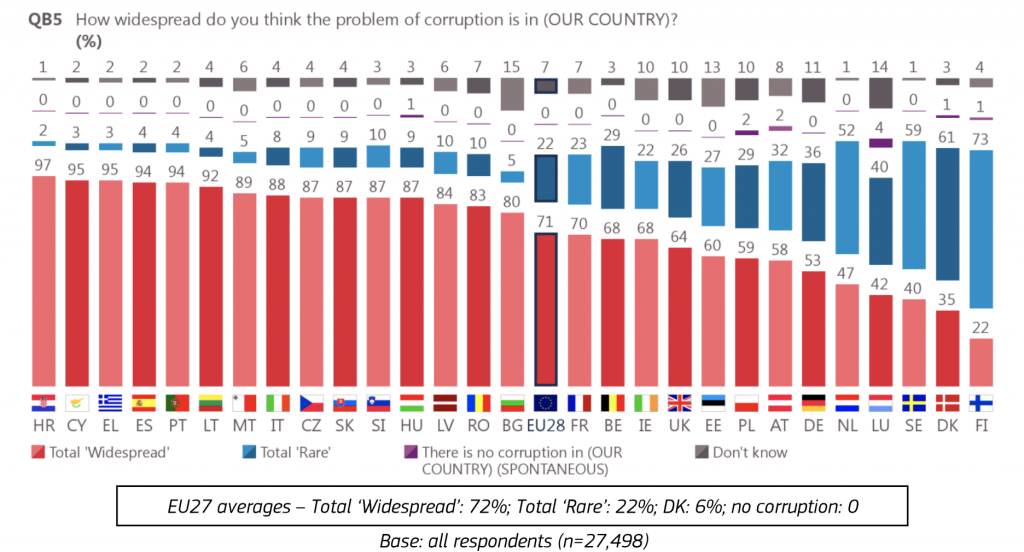Comisia Europeană a publicat miercuri, 10 iunie, rezultatele celui mai recent sondaj Eurobarometru special privind corupția. Conform sondajului, corupția este inacceptabilă pentru o majoritate considerabilă a europenilor (69 %). Puțin peste șapte din zece europeni cred că, în țara lor, corupția este larg răspândită și că există corupție în instituțiile publice naționale (70 %), dar și în rândul partidelor politice și al politicienilor (53 %).