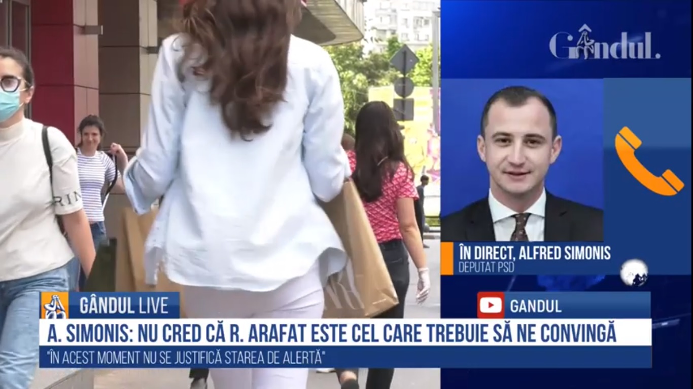 Liderul deputaților PSD, Alfred Simonis, a vorbit joi la GÂNDUL LIVE, după întâlnirea pe care șeful DSU, Raed Arafat, a avut-o cu liderii PSD, ALDE, Pro România și USR, despre poziția formațiunii sale referitoare la ideea prelungirii stării de alertă, pe fondul pandemiei de COVID-19.