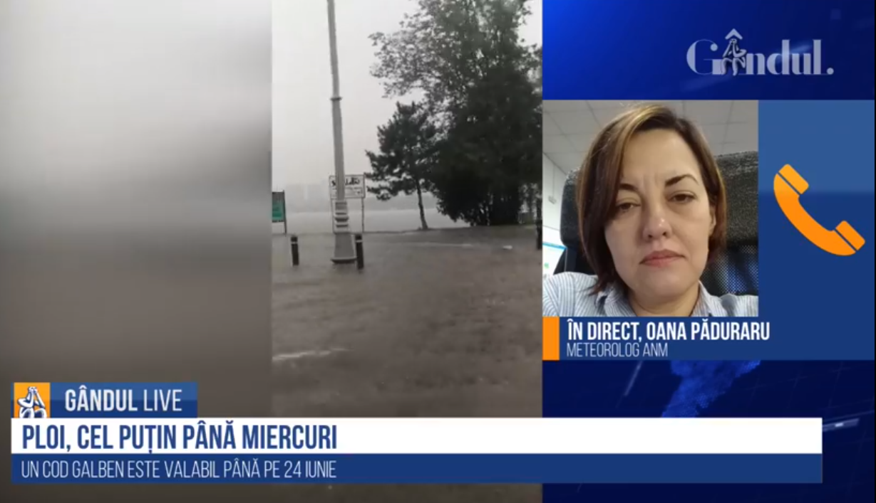 „Deocamdată nu se întrevede nicio schimbare. Cod portotocaliu până mâine dimineață la ora 10:00, după cum bine ne-am obișnuit, vorbim despre instabilitate atmosferică în continuare și de cantități însemnate de apă. În Banat, Crișana, Maramureș, Transilvania, Moldova și în zona montană a Olteniei și Munteniei ne așteptăm la averse torențiale și la cantități de peste 40 de litri pe metru pătrat și pe arii restrânse de 50-80 de litri pe metro pătrat. Totodată, este și un cod galben în vigoare, în principal pentru partea de Sud-Est a teritoriului, dar și pentru județele din partea de Nord a Olteniei și a Munteniei, tot pentru mâine dimineață la ora 10:00, iar după aceea, în continuare, un cod galben pentru toată țara, valabil până pe 25 iunie, la 10:00 dimineața. Cantități mai mici de apă de această data, sub cod galben, 25-30 de litri pe metru pătrat și pe arii restrânse 40-60 de litri pe metru pătrat. În deosebi în Nord, Centru, Nord-Est și în zonele montane”, a declarat Oana Păduraru la Gândul Live.