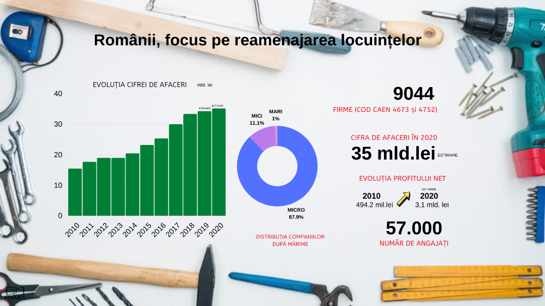 Potrivit datelor Frames,   afacerile companiilor care activează în comerțul cu ridicata și amănuntul al materialelor pentru construcții, echipamentelor sanitare și de încălzire (COD CAEN 4673 și 4752) ar putea atinge, în 2020, nivelul de 35 de miliarde de lei, cu peste 20 de miliarde de lei mai mult decât în 2010.