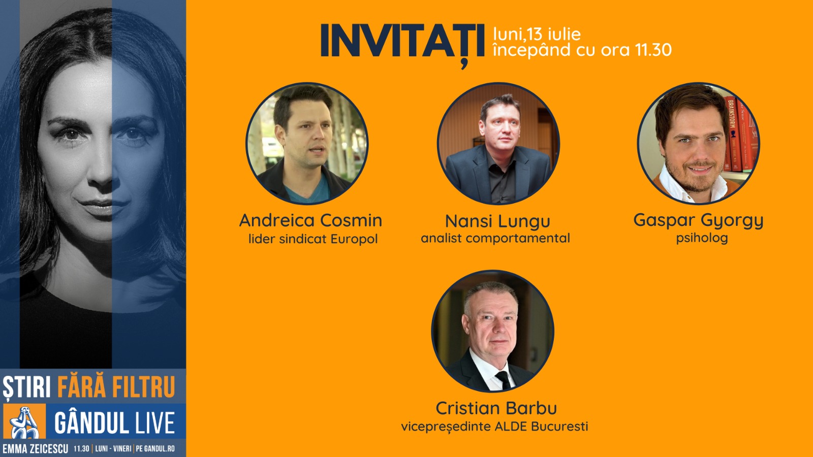 Gândul Live. Cosmin Andreica, lider sindicat Europol, Nansi Lungu, analist comportamental și Cristian Barbu, vicepreședinte ALDE București, printre invitații Emmei Zeicescu, luni, 13 iulie, începând cu ora 11.30