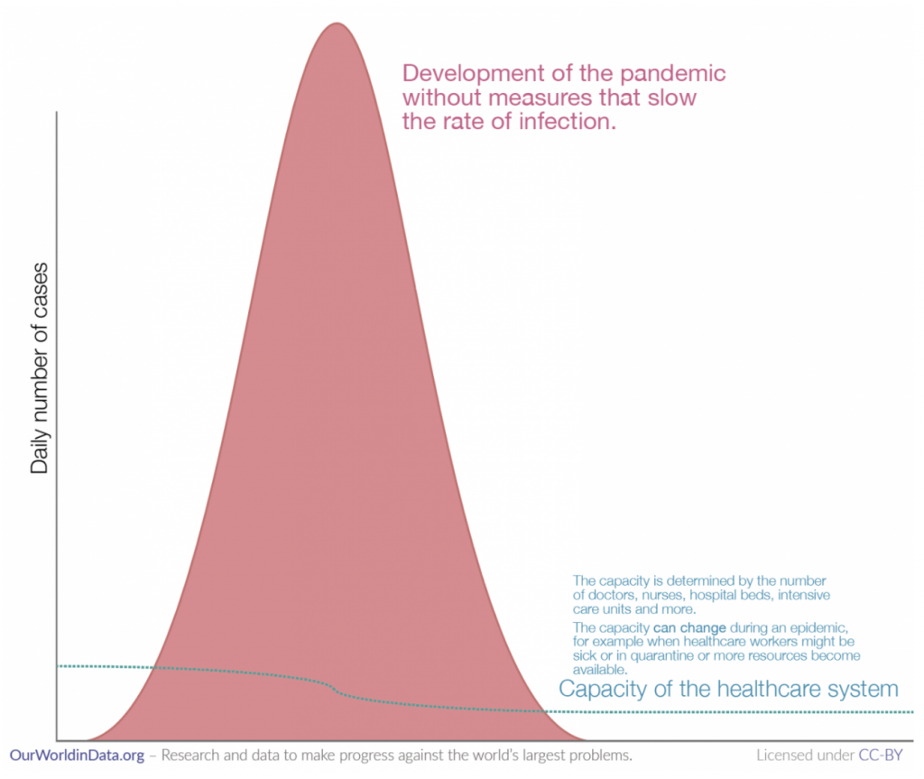 Un medic poate ajuta 10.000 de pacienți unul după altul, dar un medic nu poate ajuta 10.000 de pacienți atunci când toți sunt bolnavi în același timp. Un număr mare de bolnavi poate depăși capacitatea sistemului de asistență medicală (după cum arată ilustrația de mai jos).