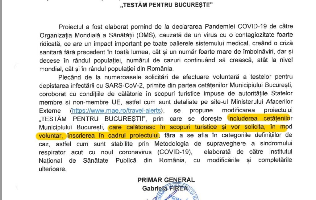 Practic, noul proiect presupune modificarea proiectului „Testăm pentru București”, „prin care se dorește includerea cetățenilor Municipiului București, care călătoresc în scopuri turistice și vor solicita, în mod voluntar, înscrierea în cadrul proiectului, fără a se afla în categoriile definițiilor de caz”, se arată în documentul publicat de Deaconescu.