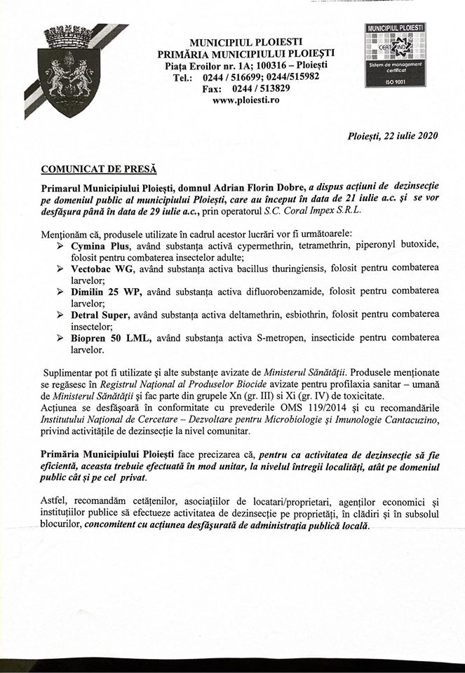 RASP Ploiesti anunță că începând cu data de 21.07.2020 se desfășoară acțiuni de dezinsecție pe domeniul public al municipiului Ploiești , acțiuni ce vor dura până în data de 29.07.2020, prin operatorul S.C. Coral Impex SRL.