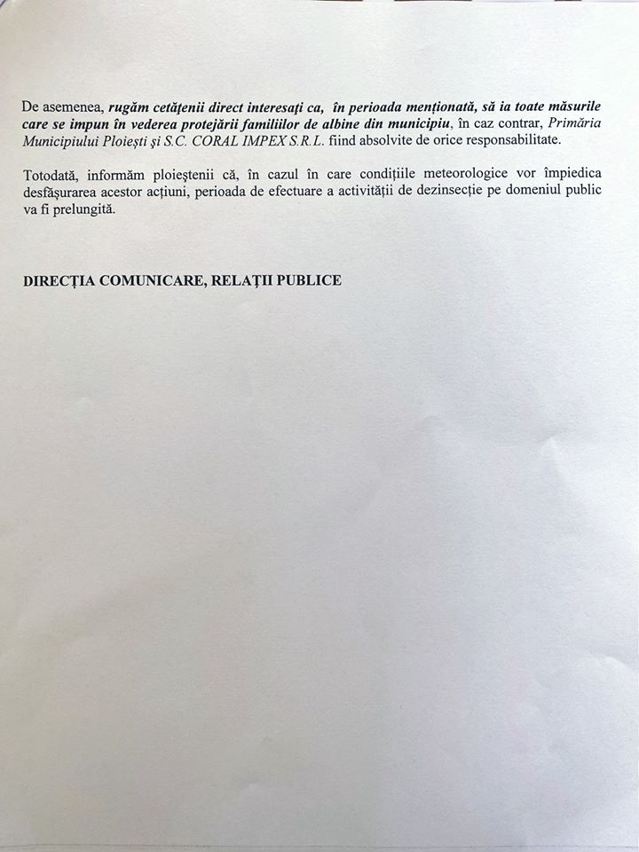 De asemenea, rugăm cetățenii direct interesati ca, în perioada menționată, să ia toate măsurile care se impun în vederea protejării familiilor de albine din municipiul Ploiești. Totodată informăm ploieștenii că, în cazul în cazul în care condițiile meteorologice vor impiedica desfășurarea acestor acțiuni, perioada de efectuare a acțiunilor de dezinsecție pe domeniul public va fi prelungită.