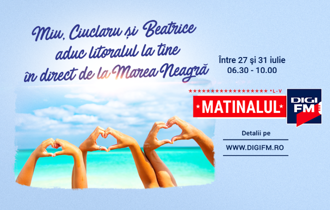 Pentru toți iubitorii de mare, Digi FM scoate Matinalul din priză și îl conectează la briză. Cinci zile, cinci dimineți cu aer sărat de mare, scăldate în razele soarelui de pe litoral. Asta vă propune Digi FM și cu asta vă așteaptă între 27 și 31 iulie, de la 06.30 la 10.00. Detalii pe www.digifm.ro.