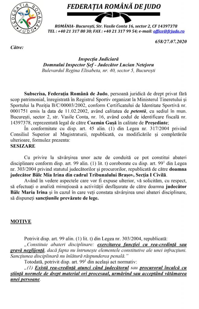 Mai mult de atât, la termenul din data de 11.03.2020 doamna judecător Irina Mia Bâlc a respins și obiectivele formulate de către apărătorul ales al Federației Române de Judo la Raportul de Expertiză Financiară și Contabilă întrucât acesta fusese întocmit fără a se ține cont de faptul că Adrian Croitoru deși desfășura două activități paralele în baza a două contracte individuale de muncă diferite, fiind remunerat de la bugetul de stat din două surse diferite, solicita obligarea Federației Române de Judo la plata contravalorii orelor suplimentare desfășurate”, se arată în plângerea pe care Cozmin Gușă a depus-o la Consiliul Superior al Magistraturii.