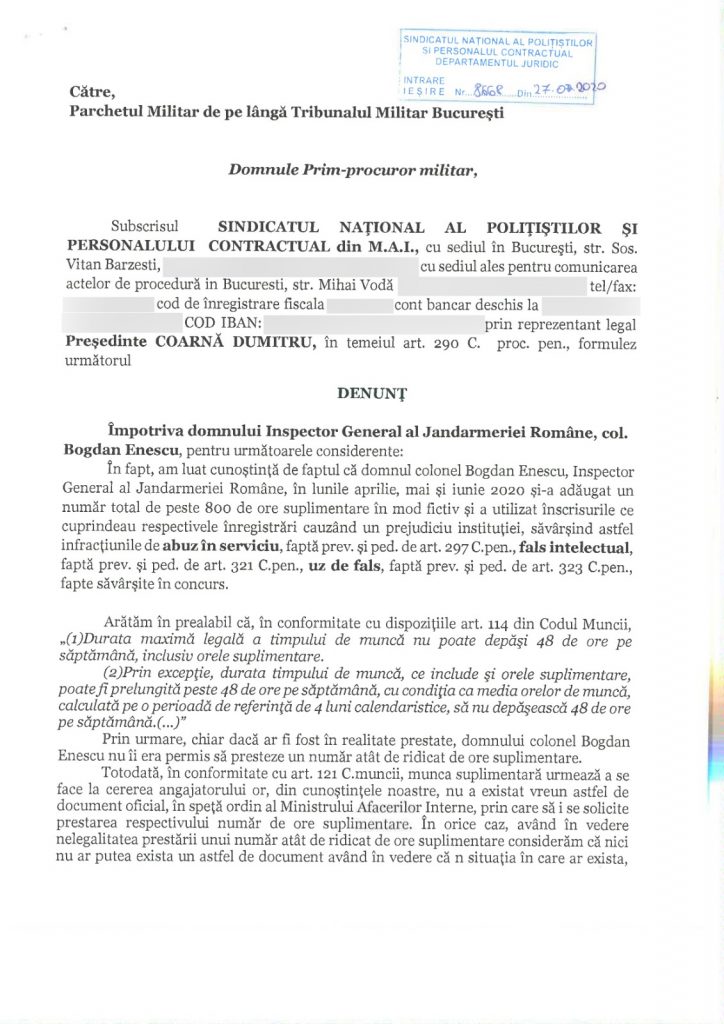 Dumitru Coarnă, președintele Sindicatului Național al Polițiștilor și Personalului Contractual (SNPPC) a arătat în denunțul depus la Parchetul Militar București că, în lunile aprilie, mai şi iunie 2020 Bogdan Enescu „şi-a adăugat un număr total de peste 800 de ore suplimentare în mod fictiv şi a utilizat înscrisurile ce cuprindeau respectivele înregistrări cauzând un prejudiciu instituţiei, săvârşind astfel infracţiunile de abuz în serviciu și fals intelectual, fapte săvârşite în concurs”.