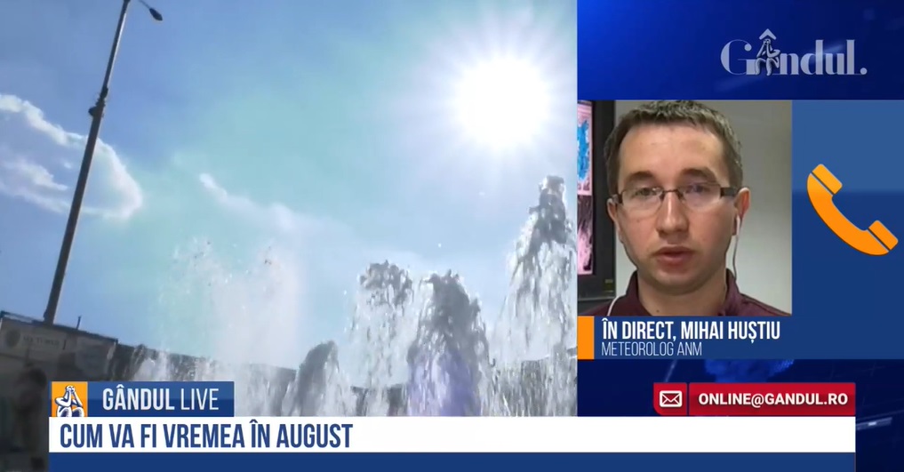 „Oricum, luna august, prin definiție, este o lună mai săracă în precipitații, o lună în general stabilă, o lună însorită în care am putea să ne bucurăm de concediu în bune condiții și se pare că așa arată prognoza, chiar pe săptămâni, progrnoza emisă săptămâna trecută, cu o vreme mai caldă decât normal aici în susd, sud est pe toată durata lunii august, cu temperaturi mai mari în general cu 1-2 grade sunt prognozate abaterile de temperatură”, a explicat Huștiu.