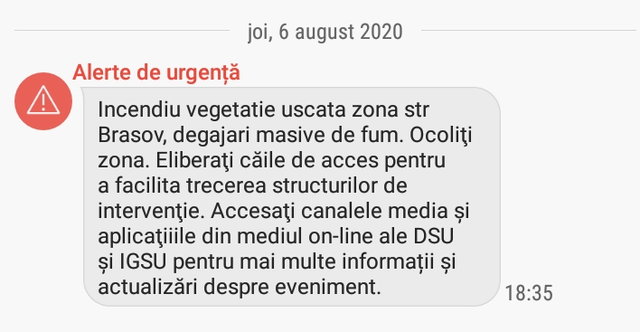 „Incendiu vegetație uscată zona Strada Brațov, degajări masive de fum. Ocoliţi zona. Eliberaţi căile de acces pentru a facilita trecerea structurilor de intervenţie. Accesaţi canalele media și aplicaţiiile din mediul on-line ale DSU și IGSU pentru mai multe informații și actualizări despre eveniment”, este mesajul pe care l-au primit locuitorii din Sectoarele 5 și 6 și din localitatea Bragadiru.