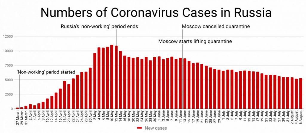 Autoritățile ruse au început să ușureze măsurile antivirus în iunie înaintea unei parade militare a celui de-al Doilea Război Mondial la Moscova și a unui vot la nivel național asupra reformelor constituționale care permit acum președintelui Vladimir Putin să rămână la putere până în 2036.
