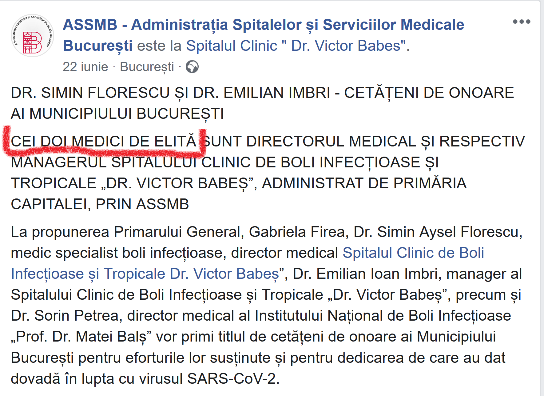 De la începerea pandemiei, pe ecranele TV și în restul presei se pronunță regulat, în calitate de mare specialist în Covid 19, dr.Emilian Imbri, director al Spitalului de Boli Infecțioase ”Victor Babeș” din București. În luna iunie, el a fost făcut cetățean de onoare al Capitalei de către primarul general Gabriela Firea în calitate de ”medic de elită”, pentru ca zilele trecute el să șocheze națiunea declarînd că a venit momentul instaurării dictaturii medicale.