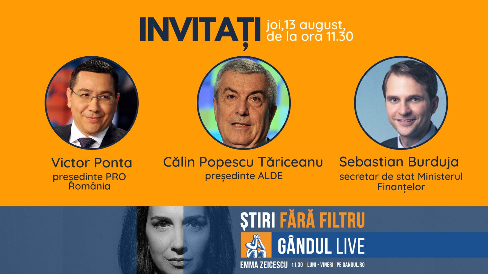 Președintele ALDE, Călin Popescu Tăriceanu, și președintele PRO România, Victor Ponta, printre invitații Emmei Zeicescu la ediția Gândul LIVE de joi, 13 august, de la ora 11.30