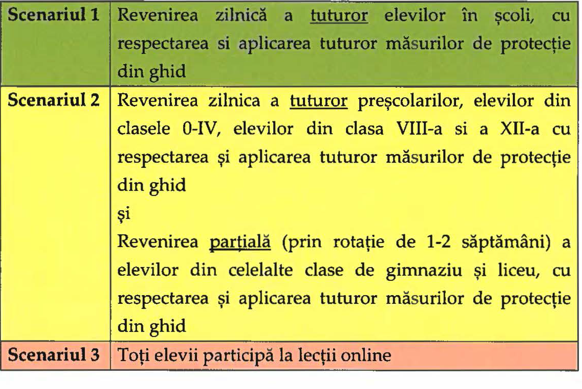 După cum reiese din graficul de mai jos, desprins din raport, în cazul de scenariu galben, cel în care există risc de infectare, elevii din clasele 0-4, a 8-a și a 12-a merg obligatoriu zilnic la școală, în timp ce restul vin prin rotație, la 1-2 săptămîni.