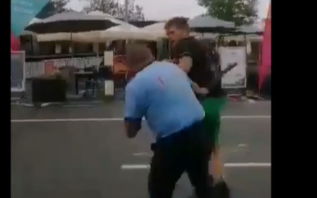 Bătaie în parcarea unui supermarket. Un agent de pază a lovit un tânăr care înjura (VIDEO)